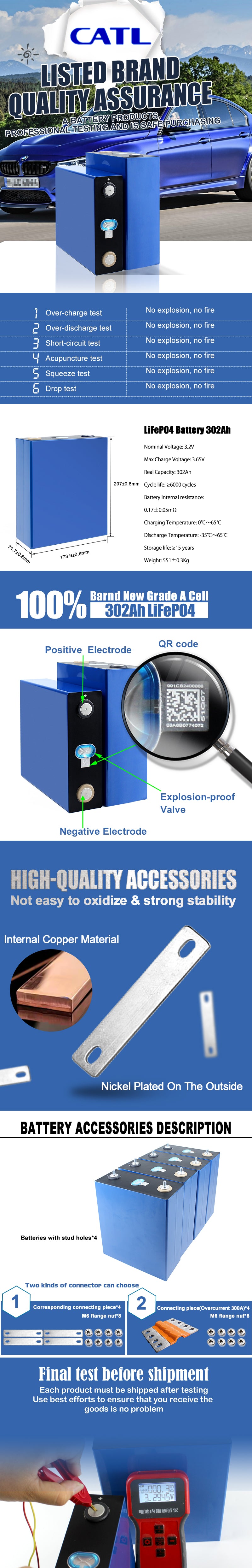 The Lifepo4 CATL 3.2V302Ah Battery are original brand new cell with clear QR code. For easy assemble, we will weld M6 studs on the cell. Each battery will send 1 pcs copper busbar and 2 pcs nuts. The price to European countries are include custom clearance and tax.