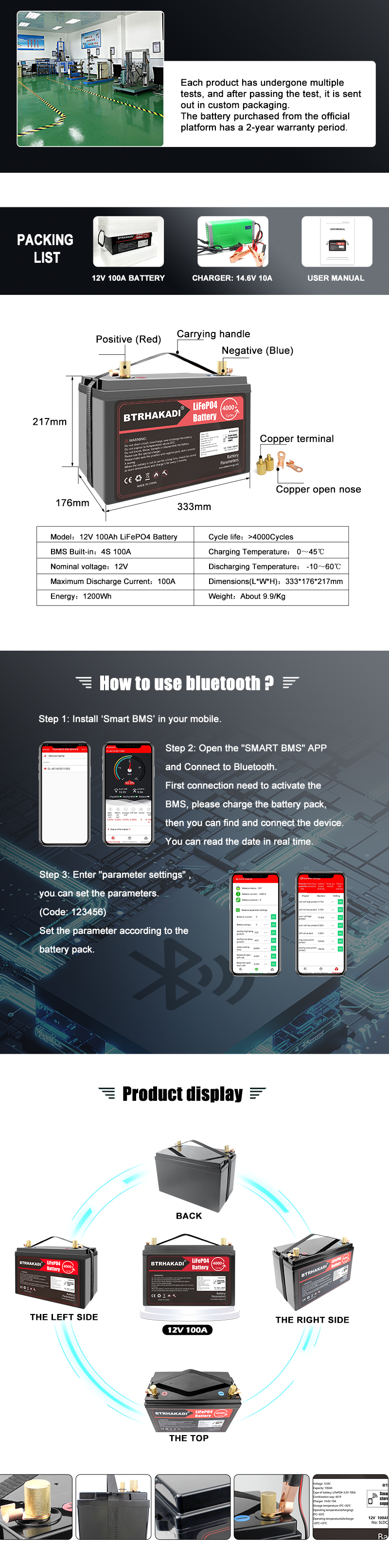 HAKADI 12V 100Ah Lithium LiFePO4 Battery Pack 1200Wh With Bluetooth BMS and 14.6V 10A Charger For Solar RV EV