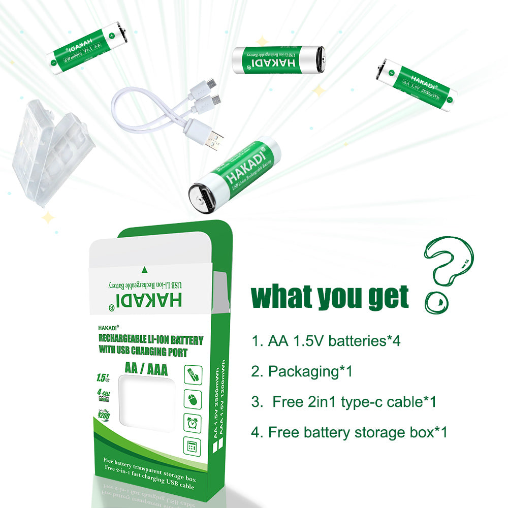 HAKADI AA NiMH Battery 1.5V 2500mWh Rechargeable Cell with 2 in 1 USB Charging Cable for toy KTV Household Electronic Device